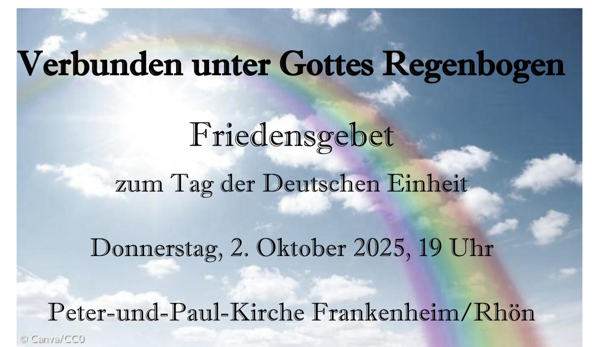 Unter dem Motto „Verbunden unter Gottes Regenbogen“ lädt die Kirchgemeinde Frankenheim anlässlich des Tags der Deutschen Einheit zu einem Friedensgebet ein. Die Andacht findet am Donnerstag, den 2. Oktober, um 19:00 Uhr in der Peter-und-Paul-Kirche in Frankenheim (Rhön, Landkreis Schmalkalden-Meiningen) statt.