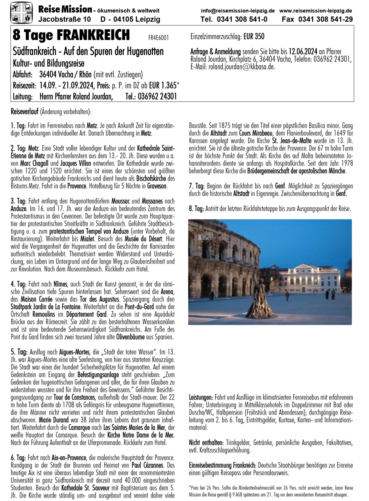 Vom 14. bis 21. September 2024 findet eine faszinierende Kultur- und Bildungsreise nach Südfrankreich statt, die sich den historischen Spuren der Hugenotten widmet.