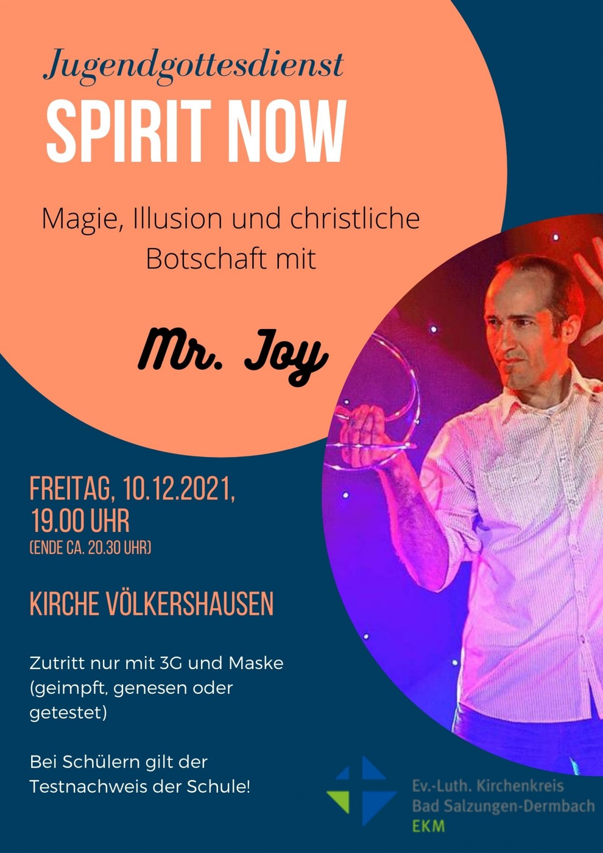 Das Jugendteam des Ev.-Luth. Kirchenkreises Bad Salzungen-Dermbach bereitet gegenwärtig den fünften „Spirit now“ Jugendgottesdienst vor, der am Freitag, den 10. Dezember, 19.00 Uhr in der St. Michaeliskirche in Völkershausen stattfindet. Mit einer faszinierenden Mischung aus Artistik, Jonglage, Illusion, Entfesselung und einer Portion Selbstironie wird Mr. Joy aus dem Jugendgottesdienst ein unvergessliches Erlebnis werden lassen.