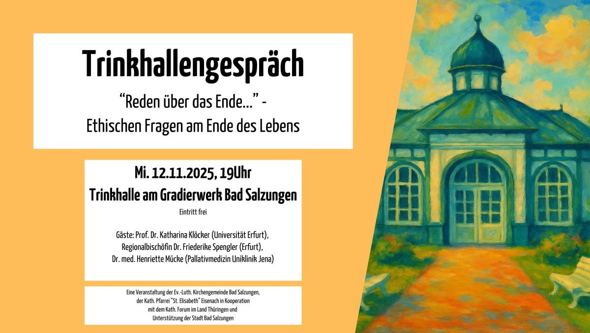 Die Trinkhallengespräche wurden von der Evangelischen und der Katholischen Kirchengemeinde Bad Salzungen ins Leben gerufen und haben sich als Forum für den Austausch über gesellschaftlich relevante Themen etabliert. Die Gesprächsreihe richtet sich ausdrücklich an alle interessierten Bürgerinnen und Bürger der Stadt und der Region – unabhängig von ihrer Konfession oder Religionszugehörigkeit.