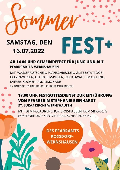 Die Kirchgemeinde Roßdorf-Wernshausen lädt am Samstag, den 16. Juli, zu einem bunten Gemeindefest nach Wernshausen ein. In diesem Rahmen wird auch Stephanie Reinhardt nach drei Jahren Entsendungsdienst – also im Pfarrdienstverhältnis auf Probe – als Pfarrerin in ihr Amt eingeführt. Freuen Sie sich auf ein abwechslungsreiches Programm für Jung und Alt: